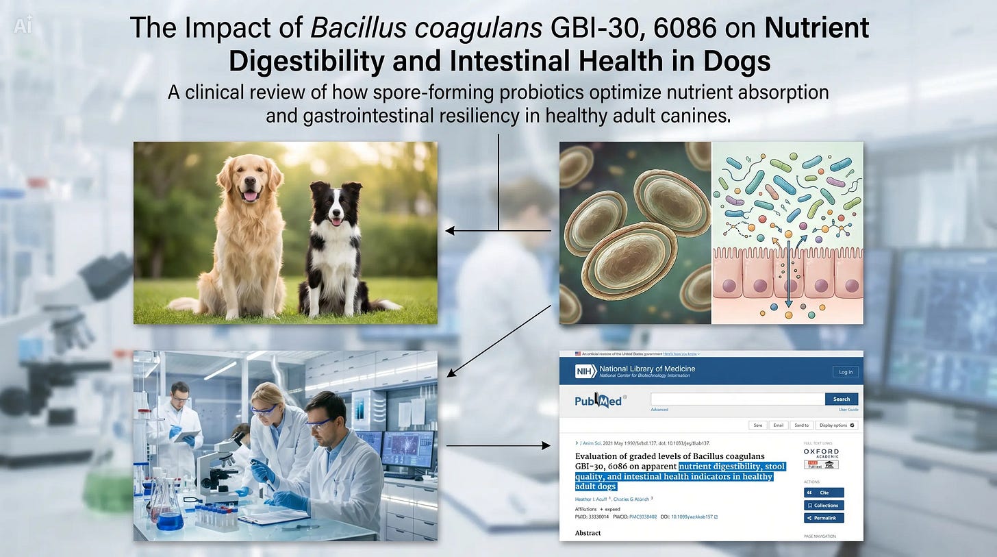 One specific probiotic has gained significant scientific interest: Bacillus coagulans GBI-30, 6086. Unlike many fragile probiotics, this is a spore-forming microorganism, meaning it possesses a natural “shield” that allows it to survive the high-heat manufacturing processes of dog kibble. Today, we’re breaking down a definitive study published in the Journal of Animal Science regarding its efficacy.